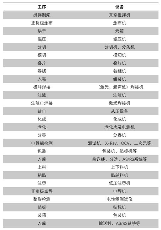 從原材料投入到PACK的產(chǎn)出,其中涉及到的設(shè)備,筆者大致整理如下。需要說明的是,以下所列的設(shè)備并非每家電池廠都已采用,而是根據(jù)企業(yè)自身情況有所取舍,比如,電芯生產(chǎn)后段及PACK階段,大多仍為半自動(dòng)設(shè)備或人工加工,自動(dòng)化程度低,尤其包裝、檢測、倉儲(chǔ)等階段。